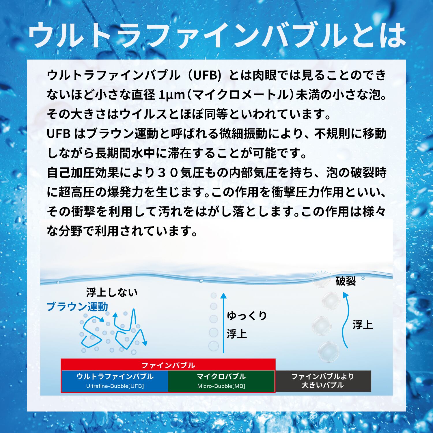 NOW Uに含まれる「ウルトラファインバブル」とは泡の直系1μm未満の非常に微細な泡です。ブラウン運動と呼ばれる微細振動により長期間水中に滞在する性質を持っています。